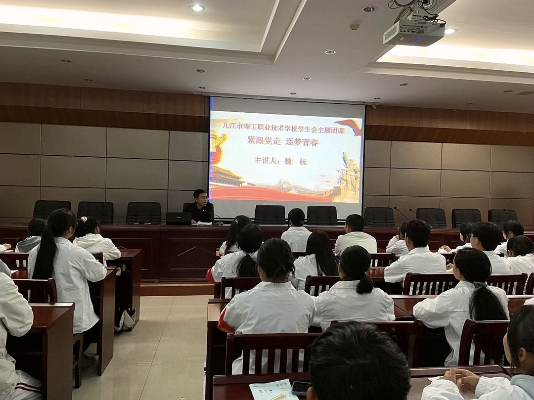 团课上,魏杭首先抛出三个问题:为什么要学习团课?为什么要紧跟党走?我要追寻什么梦想?引发全体学生会同学深思。随后他讲述共青团是党领导的先进青年的群众组织、共青团是广大青年在实践中学习共产主义的学校、共青团是中国共产党的助手和后备军。同时列举谷文昌、支月英、沈浩等同志的先进事迹,号召同学们向先进学习,向先进靠拢。他还带领大家学习了习近平总书记对青年的寄语,鼓励大家要志存高远,脚踏实地,学好知识,打好基础,增长才干,将来为中华民族伟大复兴贡献自己的智慧和力量。